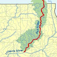 Description: The Fox River runs from its origin in Waukesha, Wisconsin to the confluence with the Illinois River in Ottawa. Flowing for a total of 115 miles in Illinois, the Fox River contains 13 dams and 15 major tributary streams. The upper river is very low gradient, increasing in slope downstream of Algonquin and continuing through a highly urbanized area where most of the dams are located. Downstream of Yorkville, the river is free flowing through ag-land to the Dayton Dam, 5 miles upstream of the Illinois River.