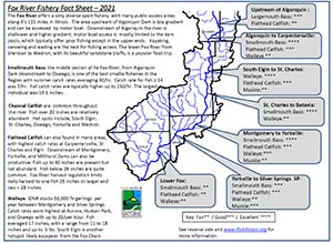 River Access: The Fox River has many public parks in the upper and middle sections. Although there are fewer public areas in the lower river, Silver Springs State Park near Plano offers good access. Boats can be used in many areas of the upper river, while the middle and lower sections are shallow and wadable through much of the year. The lower Fox River from Yorkville to Wedron has several popular canoe floats, which is a great way to access good fishing areas.