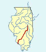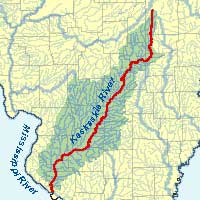 Description: The Kaskaskia River is the largest stream found entirely within Illinois. From its headwaters just west of Champaign to its mouth on the Mississippi River above Chester, the Kaskaskia winds its way across nearly 300 miles of central and southwestern Illinois. Its watershed (the land area draining into it) encompasses all or parts of 22 counties and about 10% of the state's total land area.