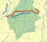 The Kishwaukee River Basin covers an area of approximately 1,218 square miles, spanning seven counties in northern Illinois, including parts of Boone, McHenry, Kane, DeKalb, Ogle, and small parts of Lee and Winnebago counties. The mainstem of the river empties into the Rock River about 3 miles south of Rockford, Illinois. It is formed by two branches which unite just south and west of Cherry Valley, IL. The North Branch arises in east-central McHenry County and flows to the west to near Rockford, where it turns south before uniting with the South Branch. The South Branch has its origin on a moraine just north of Shabbona. It flows northeasterly to the village of Genoa, where it turns to the northwest before uniting with the North Branch The two branches thus united, then flow only a short distance before emptying into the Rock River.