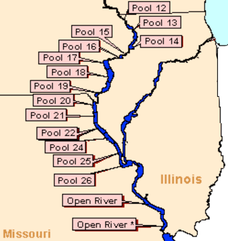 Pool 26 extends from Lock & Dam 26 located near Alton, Illinois upstream to Lock & Dam 25 located near Winfield, Missouri. The LTRMP Pool 26 study area includes a portion of the Illinois River. (see map)