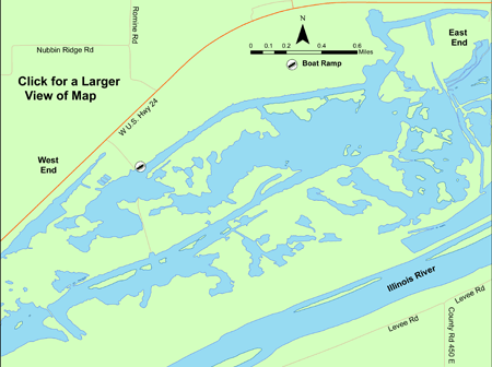 History and Status of the Sport Fishery: The former bottomland lake and marsh was leveed and drained for agricultural practice from 1910 through 1958. From 1958 to1974 approximately 90 percent of the site was strip-mined for coal. The strip-mined areas have since been reclaimed and purchased by the State of Illinois. Under the management of the Illinois Department of Natural Resources (1978 - present) the primary objective for the site is to establish a freshwater marsh providing fish and wildlife habitat in the Illinois River Valley.