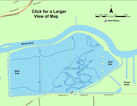 Description: Powerton Lake was constructed and filled in 1971 by Commonwealth Edison Company. Its purpose was to provide cooling water for a fossil fuel fired electric generation facility. Powerton Station was constructed in the 1930s, but greatly expanded in 1971. Water quality law made it necessary for the plant to construct a cooling lake, rather than using the Illinois River for cooling the heat exchanger. Powerton Lake was built in a drainage district adjacent to the Illinois and Mackinaw Rivers and encompasses 1426.0 acres of water. The Lake was built in the shape of an extended rectangle and has very little structure. The maximum depth is 18 feet with an average depth of about 8 feet. Water flow is from the plant discharge on the East side and flow is directed toward the west by a series of baffles. Water turn-over is about every 48 hours through the plant intake at maximum cooling flow capacity. The Illinois Department of Natural Resources signed a cooperative agreement with Commonwealth Edison Company in 1984 to open Powerton for fishing and waterfowl hunting. That lease was renewed in 2010 to extend another 10 years. There is a double concrete ramp and parking for 90 cars at the access which is located along the Manito Blacktop on the south side of the lake.