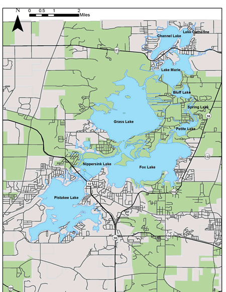 Location: The Fox Chain O' Lakes is located 50 miles northwest of Chicago off Illinois Route 173 and U.S. Route 12 near the cities of Antioch, Fox Lake, and McHenry.