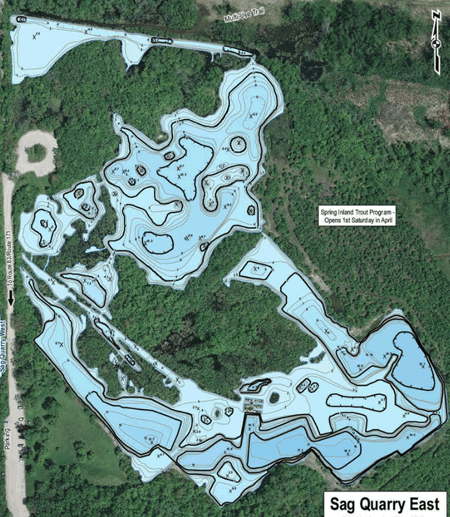 Location: Located in Lemont on Route 83 and Archer Avenue just north of 111th St. This lake, along with Sag Quarry West is an old limestone quarry.
