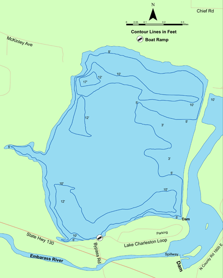 Description: The Charleston Lower Channel Lake is the impounded Embarras River. The lake covers 330 surface acres with a maximum depth of 12 feet and average depth of 5.7 feet. The Charleston Side Channel Lake is the primary water supply for the City of Charleston and is separated from the Embarras River by a dike that provides excellent shoreline access. Recreational opportunities include fishing and limited boating. Public boat launching facilities are available. There is a no-wake regulation in effect on the entire lake.