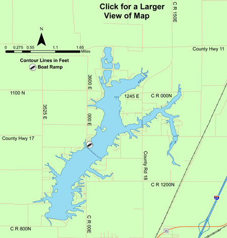 Additional Lake Information: Pole and line fishing only, with no more than two poles allowed per person, with only two hooks or lures per pole. After sunset the entire lake is no wake. Camping, a swimming beach, live bait, fishing tackle, ice, and drinks are available.