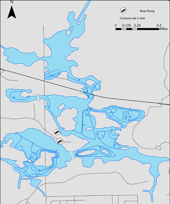 Additional Lake Information: Two pole and line only. Fishing piers, handicap access, boat/kayak rentals, and live bait/tackle are available throughout the summer from a concessionaire. Concrete boat launches are available in the two larger impoundments and a paved bike path with numerous parking areas makes accessing the lakes very easy. Boats with electric motors are allowed, however gas motors must be removed. No fish cleaning station is available.