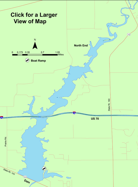 Description: This is a 550-acre water supply lake owned by the city of Highland. The fishery of the lake is cooperatively managed by the IDNR and the city of Highland. The shoreline of the lake includes rock, woody structure, and aquatic plants. There is one concrete boat ramp located in Silver Lake Park. There is limited shore angler access.