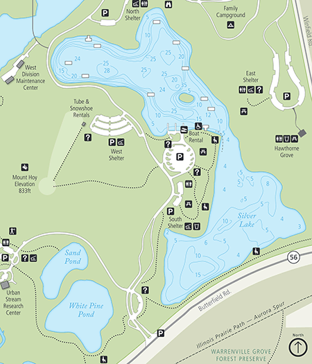 Location: Silver Lake is located withing the Blackwell Forest Preserve on Butterfield Road, 0.5 mile west of Winfield Road in Warrenville, south of Mack Road.
