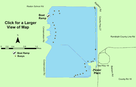 Description: Perched cooling lake impounding 2,018 surface acres of water with approximately 75% of shoreline comprised of rock rip-rap. Boat motor size - motors up to 50 HP wake allowed; motors over 50 HP are NO WAKE ONLY. Two lane concrete boat ramp and fully blacktopped car/trailer parking lot available. Shore angler access is located on the west and north sides of lake.