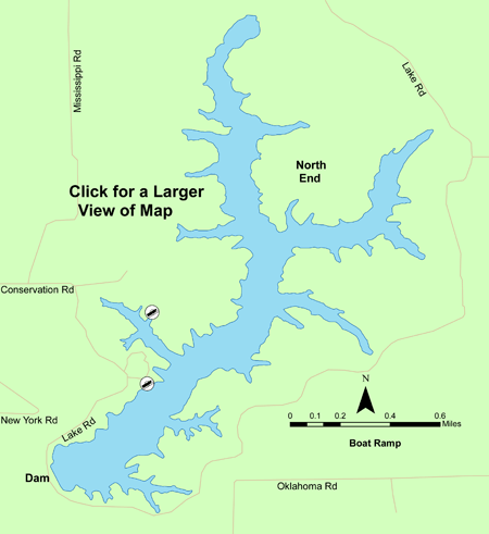 Description: This scenic 248-acre lake contains a good percentage of woody habitats, which is great for attracting and holding fish. There is a concrete boat ramp and plenty of parking in the blacktopped parking lot. There is also a gravel boat ramp for small watercraft. Shore angler access is available at many areas around the lake. Boat motors - motors up to 10 HP wake allowed; motors over 10 HP are NO WAKE ONLY
