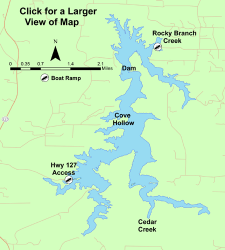 Location: Cedar Lake is located five miles southwest of Carbondale in Jackson County. The City of Carbondale boat access area is located at the end of Cedar Creek Road off of Old Route 51 South. Another boat access area can be found south of Murphysboro off of State Route 127. Follow Boat Dock Road to this ramp.