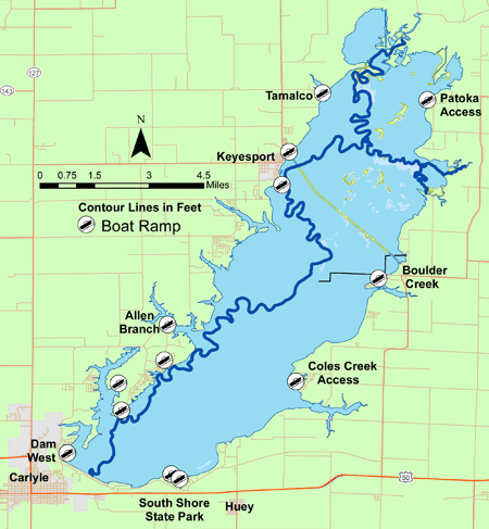 Additional Lake Information: There is no outboard motor size limit. Eleven boat ramps are located at various recreational areas around the lake. In addition, there are three boat ramps on the Kaskaskia River, one just above and two below the reservoir. Carlyle Lake offers several camping facilities as well as cottages. There are two bait shops located in town and three full-service marinas.