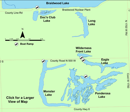 History and Status of the Sport Fishery: Habitat enhancement projects have been completed on many of these lakes and ponds. Aquatic vegetation, while present, has not required any active management. Most of the larger water areas contain largemouth bass, bluegill, white and black crappie, channel catfish, carp and various other species. The IDNR presently stocks channel catfish into several lakes on a rotational basis. Redear sunfish have been stocked into Clear Lake and Ponderosa Lake as well. Northern pike stockings into several lakes have generally failed. A walleye stocking program has been approved for Monster Lake with the initial stocking scheduled for 2015. No special mercury advisory or other contaminant-related consumption advisories pertain.