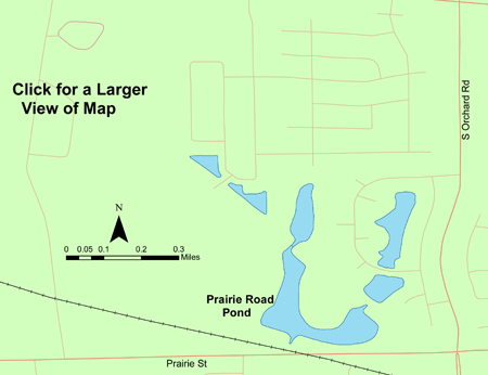 Location: Prairie Road Pond is located in Kane County, 200 yards west of Orchard Road on the north side of Prairie in Aurora.