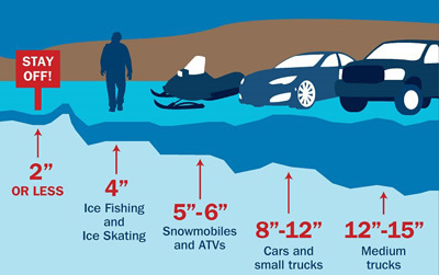 Note: These guidelines are for new, clear solid ice and many factors other than thickness can cause ice to be unsafe.
