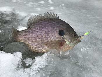 For panfish tackle, small is basically the rule. The ice jigs for panfish are usually a weighted size 8 to size 14 hook in varying shapes. A trip to a local bait store should set folks up with the "hot" sizes and colors.
