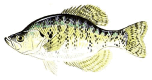 Reproduction: Black crappie reproduction is similar to the white crappie. Spawning takes place in late April and May when water temperature reaches about 56°F. The male fans out a depression with his caudal fin in 3 - 10 feet of water. Female white crappie enter the spawning area and deposit their eggs in one or more of the nests, which are immediately fertilized by the male fish. The number of eggs in a crappie nest is variable, but a nest can hold up to 20,000. It is practically impossible to distinguish the males from the females, even just before spawning.